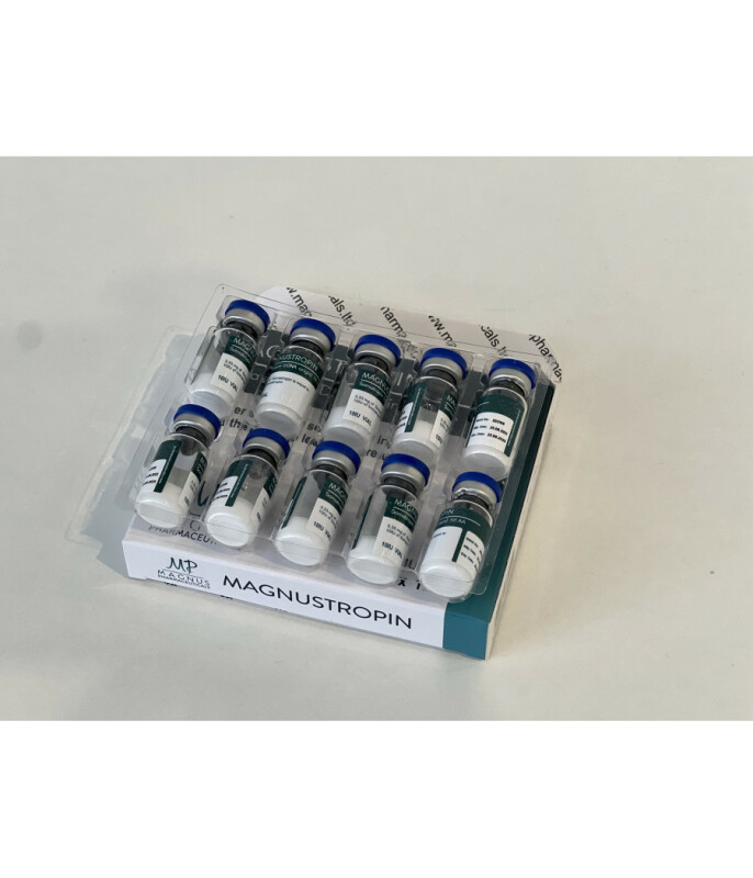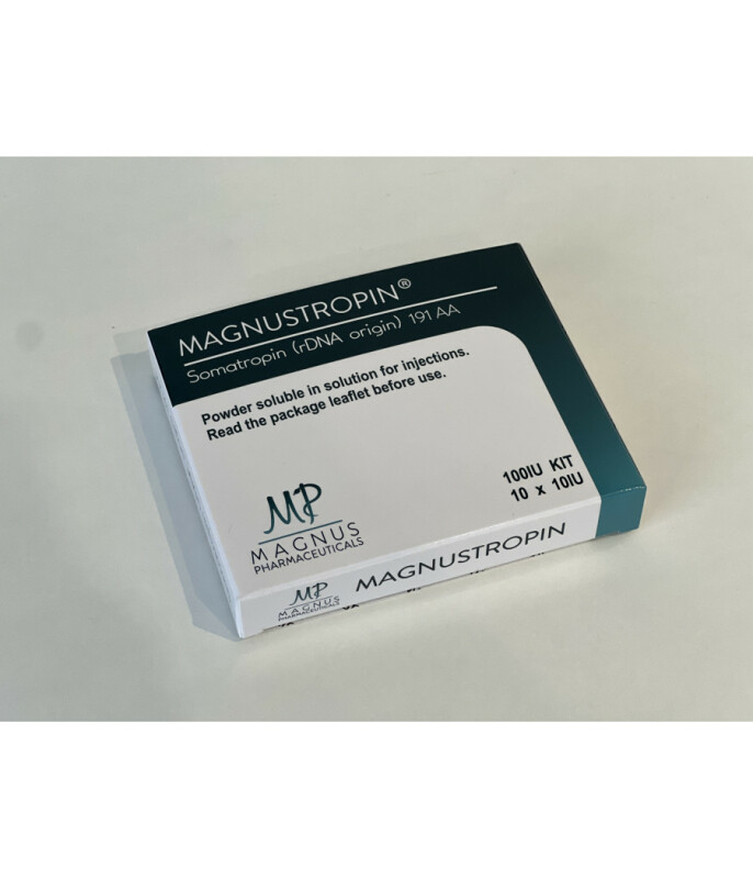 Гормон роста Magnustropin (Магнустропин)На рынке добавок для спортсменов ежегодно появляется большое количество новинок. Изобилие ассортимента усложняет поиск продукта, который бы гарантированно давал ожидаемый эффект, при этом не вызвал осложнений в организме. Все что нужно для покупки действительно высококачественного препарата — отдавать предпочтение проверенным брендам. Особенности гормона роста МагнусMagnustropin — это высококачественная синтетическая версия гормона роста человека (HGH), разработанная фармакологическим брендом, получившим отменную репутацию во всем мире. Основа препарата — соматотропин, обладающий следующими характеристиками:способствует мощному анаболическому и анти-катаболическому действию — ускоряет рост мышц и тормозит их разрушение;в разы повышает синтез белка, при этом угнетает процесс распада, замедляя его;регулирует запасы энергии, обеспечивая бодрость и прилив сил на протяжении дня;укрепляет скелет, позволяя выдерживать костям и позвоночнику большую нагрузку, без риска травматизации;предупреждает отложение подкожного жира, усиливает его сгорание;увеличивает соотношение жировой и мышечной массы;повышает иммунитет и сопротивляемость организма негативным внешним факторам.Магнустропин обеспечит энергией, нужной для роста тканей, прибавит сил и выносливости, что в особенности важно для тяжелоатлетов. Действие гормона роста МагнустропинАктивность препарата начинается уже при его попадании в кровоток — с этого момента запускается стимуляция в печени фактора роста инсулина — IGF-1. Возрастает синтез белков, через симбиоз с рецепторами в мышечных тканях. В системе организма СТГ связывается с соматотропином. Последний эффект способствует возрастанию показателей FFA — свободных жирных кислот, благодаря чему, для получения энергии, организмом потребляются жиры вместо углеводов.Как принимать гормон роста MagnustropinКупить гормон роста Magnustropin возможно во флаконах для инъекций — 10фл х 10ME. Заказывая на нашем сайте, вы получаете к покупке необходимое количество инсулиновых шприцов. Рекомендуемая производителем суточная доза Магнус составляет 2-17 ME. Бодибилдеры принимают 8МЕ в большинстве случаев. Встречается и прием более высоких дозировок — до 24МЕ, что может повлечь за собой проявление побочных эффектов. Курс гормона роста MagnustropinАтлеты советуют оптимальный курс, продолжительность которого составляет 2 месяца. Некоторые ошибочно думают, что лучше колоть увеличенные дозы, но в короткие сроки. Однако прием малой дозировки на протяжении длительного времени более эффективно для мышц, и не несет риска для здоровья. Выбор схемы 4ME/день за 50 суток будет идеальным решение, а 8ME/день за 25 дней уже может для некоторых стать нагрузкой.Дозировка МагнустропинПрепарат вводится внутримышечно. Magnustropin, как любой другой гормон роста, следует применять после тренировок. Это обусловлено умеренным или низким уровнем глюкозы в крови. Иногда спортсмены делают инъекции стандартной дозировки дважды в день: после интенсивных занятий и перед сном.Гормон роста длительное время исследовался на добровольцах, благодаря чему ученым удалось вывести интересную статистику. Так, научные данные показали, что принимающие самостропин женщины имели показатели по сжиганию жира на 30% больше, чем у не принимающих. Если говорить о 
