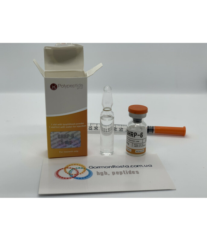 Одним из самых популярных препаратов для стимуляции секреции гормона роста среди спортсменов и бодибилдеров является GHRP 6 (Гексарелин) от шведской компании Polypeptide, относящийся к группе пептидов. Он представляет собой цепочку аминокислот, состоящую из 28 элементов, и был разработан с целью лечения дефицита гормона роста (соматотропина). Кроме того, пептид GHRP 6 является прекрасным средством для увеличения сухой мышечной массы и повышения силовых показателей, а также сжигания жира. Его эффективность возрастает при использовании вместе с пептидным гормоном CJC-1295.Мы предлагаем купить GHRP 6 Polypeptide (флаконы по 5 мг) для стимуляции секреции гормона роста по выгодной цене, а также предоставляем скидки при покупке определенной партии (5 или 10 флаконов). При доставке гарантируется соблюдение всех необходимых условий для сохранности товара.Преимущества и эффективность пептида GHRP 6Прием GHRP 6 дает возможность бодибилдерам быстро наращивать мышцы, а также избавиться от лишнего веса за счет сжигания жировой прослойки, увеличить показатели выносливости и силы. В отличие от большинства аналогов, он не оказывает воздействия на центр выработки грелина, поэтому не влияет на аппетит. По этой причине атлеты считают пептид GHRP 6 одним из лучших средств для применения во время сушки – он дает возможность избежать потерь мышечной массы.Если вы заботитесь о своем здоровье, выбирая препараты для увеличения мышц, отдайте предпочтение пептидам GHRP 6, а не анаболическим стероидам. Хоть последние и позволяют получить результат в более короткие сроки, однако наносят серьезный вред организму. Препарат не только увеличивает мышечную массу и способствует жиросжиганию, но и улучшает состояние суставов, соединительных и костных тканей, кожи, повышает иммунитет, способствует омоложению организма.После курса приема препарата наблюдаются следующие позитивные результаты:стимуляция секреции соматотропина;уменьшение жировой прослойки;снижение уровня холестерина;усиление рельефности;увеличение силовых показателей.Побочные эффекты при соблюдении дозировки и правил приема выявлены не были. Способ применения и дозировкаТак как после подкожных инъекций концентрация гормона роста в крови резко увеличивается в течение 30 минут, а затем идет на убыль на протяжении примерно 4 часов, принимать GHRP 6 необходимо три раза в день. Рекомендуемая дозировка составляет 1 мкг на 1 кг веса. Для приготовления раствора рекомендуется использовать специальную бактерицидную воду. Способ применения: подкожные или внутримышечные инъекции. Хранить препарат (как в сухом виде, так и готовый раствор) необходимо в холодильнике при температуре 2-8 градусов. Чтобы заказать пептид GHRP 6 в любой город Украины, оформляйте заявку на нашем сайте или свяжитесь с менеджерами. Наш интернет-магазин гарантирует высокое качество препарата и отсутствие подделок.В нашем магазине Вы можете купить GHRP 6 от производителя! Своим клиентам мы предлагаем пептиды и другие товары практически по себестоимости!Цены на все снижены, поэтому оригинальный GHRP 6 сегодня можно купить дешевле, чем вдругих аналогичных магазинах!Также советуем прочесть следующие статьи :Как принимать пептиды?Принципы разведения и расчет дозировок.Способы разведения пептидов.Как составить собственый курс пептидов.Правила пользования пеп