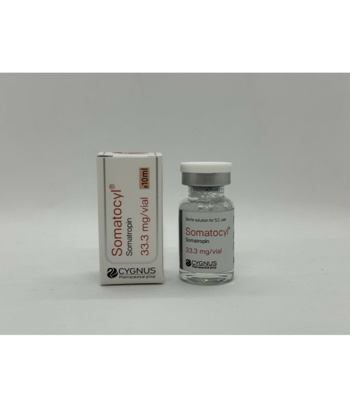Гормон роста Somatocyl (Соматоцил) 1фл х 100ME купитьСоматоцил – препарат на основе синтетического гормона роста. Он изготовлен компанией Cygnus. Многие атлеты знакомы с ней по фарме, которая отличаются хорошим качеством и пользуются успехом среди наших клиентов. На выгодных условиях заказать Somatocyl вы можете у нас.Свойства Somatocyl (Соматоцил)Сегодня синтетический соматотропин является одним из самых востребованных препаратов среди билдеров. Он начал использоваться еще в восьмидесятых. Однако из-за высокой стоимости ГР в те годы применялся исключительно профессиональными билдерами.Сегодня ситуация изменилась и цена Somatocyl выглядит весьма привлекательно. Хотя этот препарат является новинкой на отечественном рынке, он уже хорошо востребован билдерами. Отметим основные положительные качества рассматриваемого ГР:позволяет набирать мышечную массу хорошего качества;ускоряет процессы редукции адипозных тканей;улучшает работоспособность суставно-связочного аппарата;эффективно подавляет катаболические реакции;активирует процессы гиперплазии мышечных тканей.Недорого купить Somatocyl вы можете в нашем магазине.Правила использования Somatocyl (Соматоцил)Использовать Somatocyl могут как мужчины, так и женщины. Так как активный компонент препарата обладает небольшим периодом полужизни, то вводить ГР следует каждый день. Причем желательно это делать за 2-3 приема. Рекомендуемая суточная дозировка находится в диапазоне 5-20 единиц.Длительность курса Somatocyl находится в диапазоне 3-6 месяцев. Начинайте курс с минимальной дозировки – 5 единиц. Если в течение 10-14 суток проблем со здоровьем не наблюдается, то доза увеличивается. Как только она достигнет отметки в 10 единиц и более, то начинайте вводить ГР за два приема. Для увеличения эффективности курса ГР его можно сочетать с тиреоидными гормонами, стероидами, пептидами и т.д. Хотя это новый препарат, в сети уже можно найти отзывы о Somatocyl. Также советуем прочесть следующие статьи :Как использовать гормон роста, пояснение "на пальцах"Инсулин - раскладываем по полочкам.Гормон роста для лечения суставов, связок и межпозвоночных грыж.Применение гормона роста в косметологии и медицине.Гормон роста, инсулин, Т4 и Т3